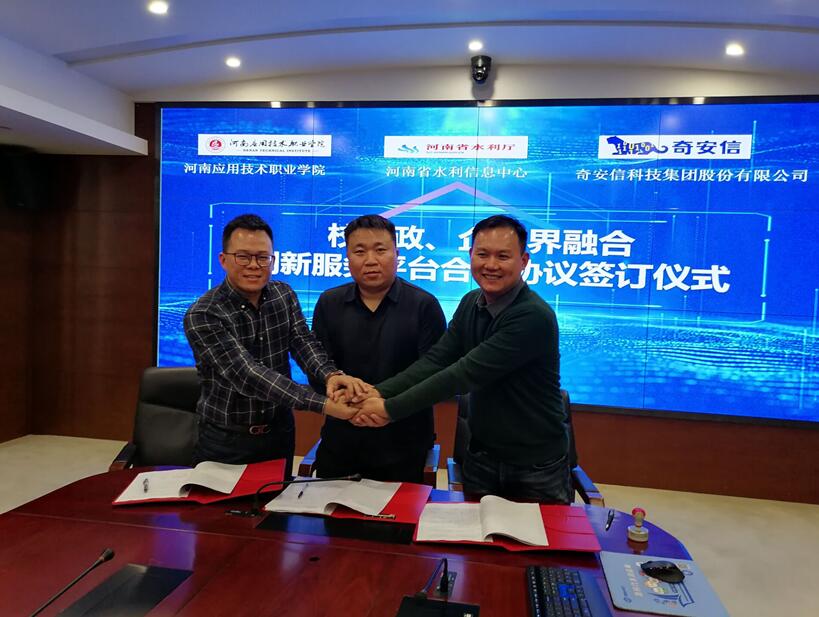 仪式上,太阳成集团tyc33455cc与河南省水利厅信息中心签署实践教学基地协议;太阳成集团tyc33455cc、河南省水利厅信息中心和奇安信科技集团共同签署校、政、企跨界融合创新服务平台合作协议。平台的建立,打通了跨界发展的渠道,构建了融合递进的模式。