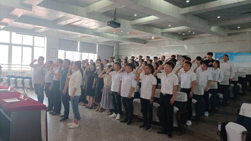大会在庄严的《国际歌》中拉开帷幕。首先,公司党总支全体党员教师和50名员工预备党员全体起立,面向党旗,庄严宣誓,对党深情告白和郑重承诺。王瑞岩同学作为预备党员代表发言,她表示,做为一名新时期的员工党员,最好的宣言就是利用自己所学的科学文化知识去更好的为人民服务,奉献社会。