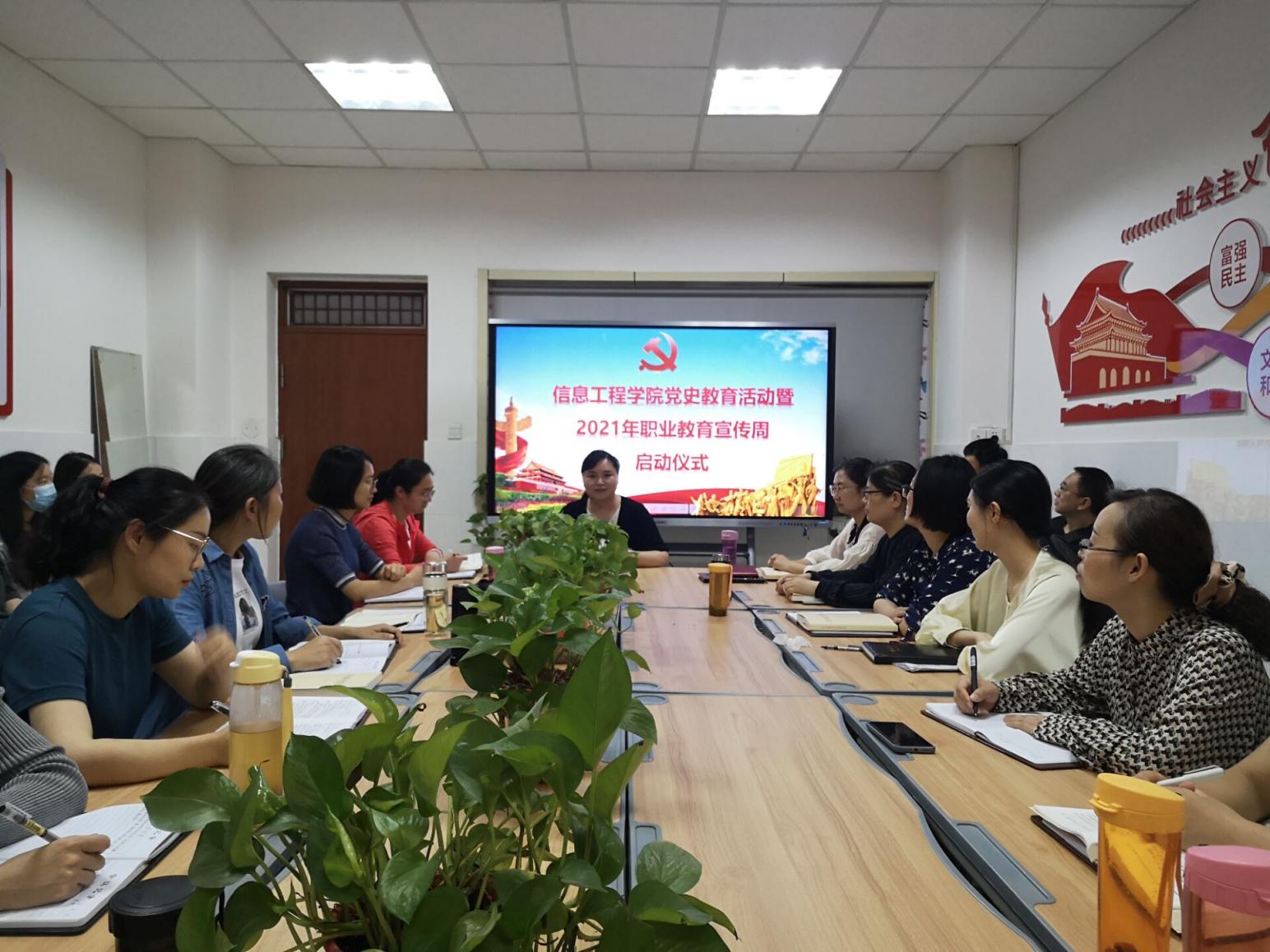 为大力弘扬劳动光荣、技能宝贵、创造伟大的时代风尚,5月21日下午,太阳成集团tyc33455cc职业教育活动周启动仪式在实训楼E315党员活动室举行,院部领导及专兼职教师参加了本次会议。会议由王雷经理主持,他对2020年太阳成集团tyc33455cc师生取得的建设成果进行了总结和剖析,从专业建设、教师培养、员工发展、校企合作、技能大赛等方面总结了师生所取得的成绩,并表态2021年将继续积极支持师生开拓创新,坚持立德树人,把思政教育融入育人全过程,弘扬工匠精神,加强“双师型”教师队伍建设,提升专业群建设质量,打造信息技术职教品牌。党总支书记楚斌同志对本次活动的开展发言表态:当前正处于发展黄金期,加快发展现代职业教育是党中央、国务院作出的重大战略部署。职业教育活动周就是展示、宣传和推动职业教育发展的一项重要制度设计。职业活动周通过开展劳动和职业启蒙教育、职业体验、成果展示、校园文化展示等活动,让更多人感受到现代职业教育的特色与魅力。通过举办技能竞赛等活动,向社会展示广大职校员工专业技能和职业素养;开展“职业教育宣传周”活动,大力宣传党和国家职业教育方针政策。通过这一系列活动的开展,让社会更多地认识职教、关心职教、支持职教、发展职教、共享职教,积极推动形成“人人出彩,技能强国”的良好氛围。