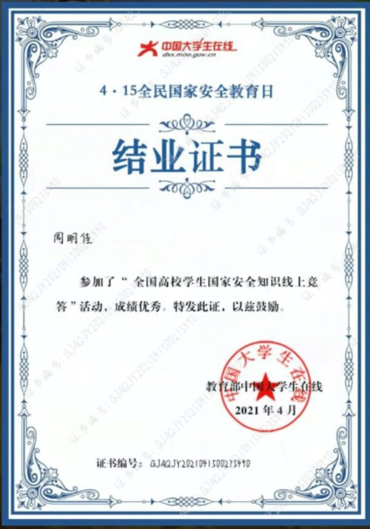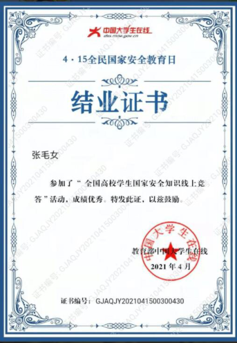 图为参与“全国高校员工国家安全知识线上竞答”活动证书