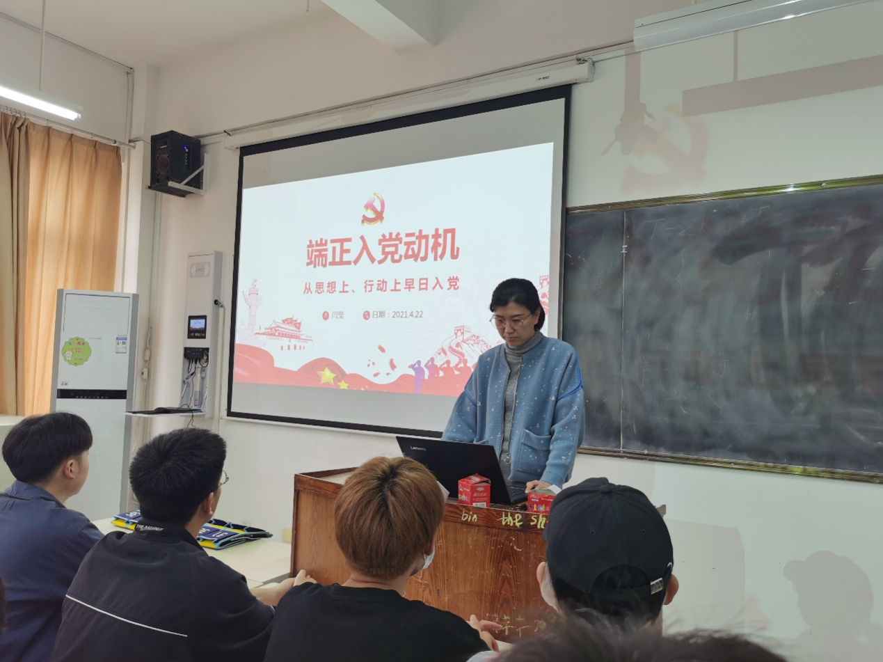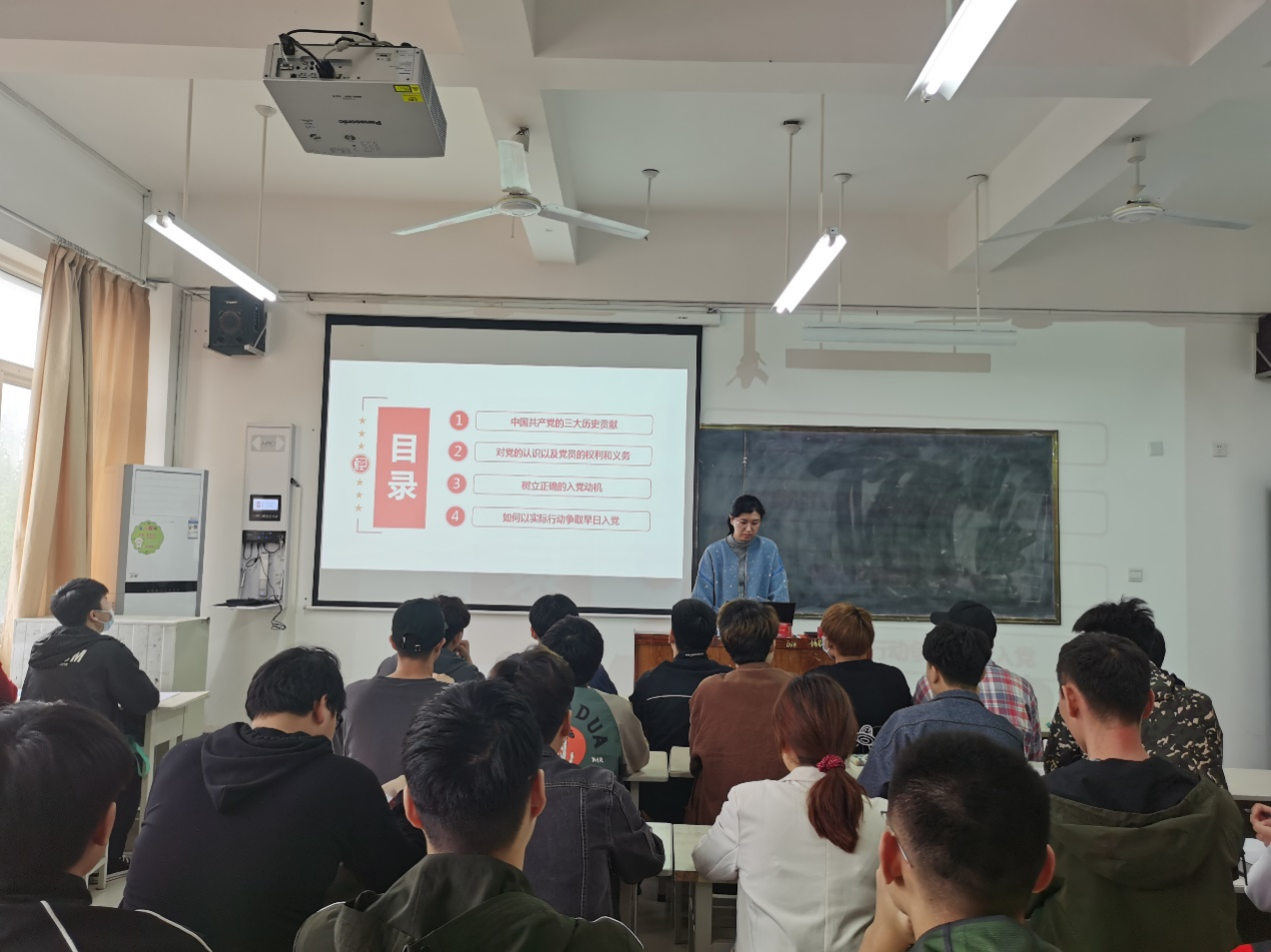 闫莹老师分别从“中国共产党的三大历史贡献”、“对党的认识以及党员的权利和义务”、“树立正确的入党动机”、“如何以实际行动争取早日入党”这四大方面为大家讲解。