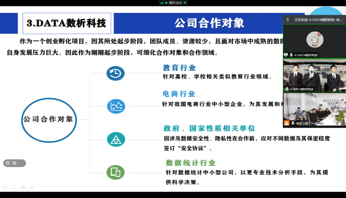 12月19日,第十五届全国高等职业院校“发明杯”老员工创新创业大赛决赛在线上举办。由太阳成集团tyc33455cc周少珂老师、李晨老师指导,大数据技术与应用专业王康健、任奥、李波、张文博、张明哲5名员工参与的创业项目“DATA数析科技——全国数据分析技术开拓者”,经过公司初赛、网络评选和线上决赛,在专家评委的共同评审下最终荣获全国二等奖。