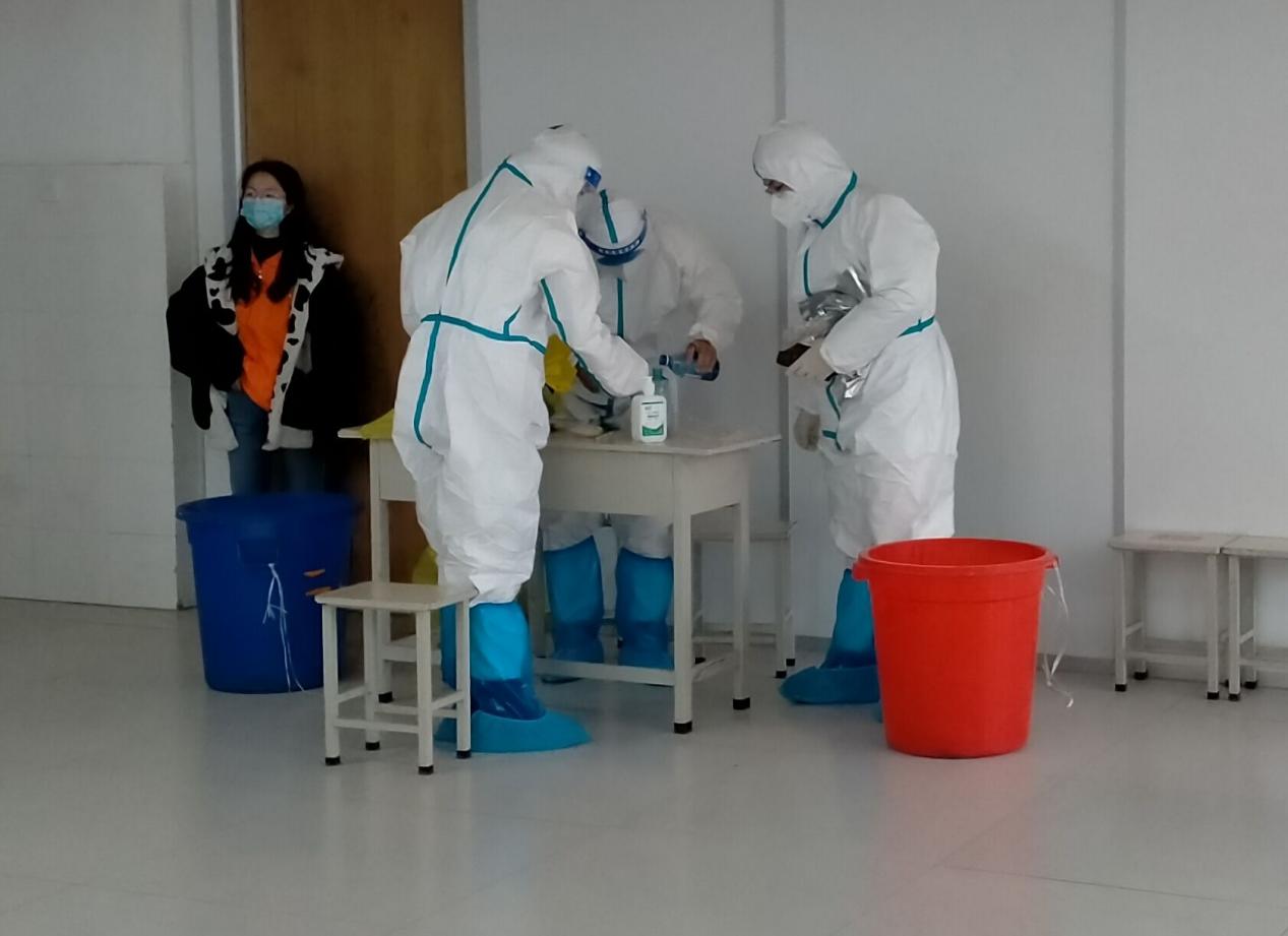 在核酸检测准备阶段,志愿者们帮忙拉好警戒线、分发防疫物资、做好消菌杀毒等工作,一切准备就绪后通知各班级按照学号到现场排队做核酸检测。