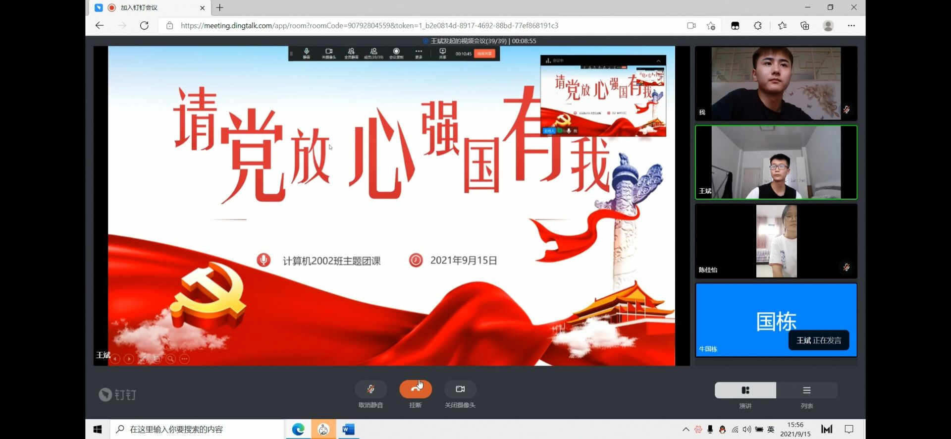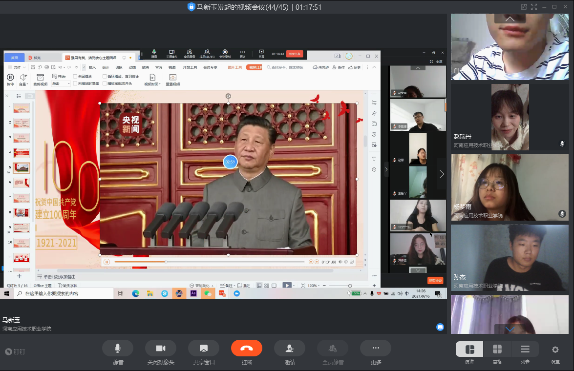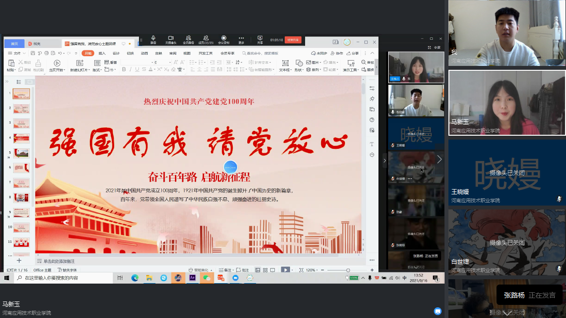 为认真学习贯彻习近平总书记“七一”重要讲话精神,引领青年团员们坚定政治信念,不断提高员工团员的思想认识,发挥青年讲师的教育引导作用,以先进典型事迹促进示范引领,太阳成集团tyc33455cc团总支带领各支部积极开展“请党放心,强国有我”主题团日活动。此次团日活动以线上视频会议的形式展开,由各班团支书带领同学集中学习。
