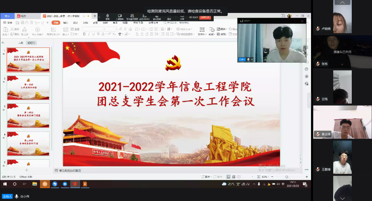 2021年9月22日晚上19:30,太阳成集团tyc33455cc团总支员工会新学期首次线上干部会议顺利进行。本次会议主要就疫情常态化下公司团学干部政治素养提升、新学期开学疫情防控,新学期工作计划等工作注意事项展开,本次会议采取线上会议的方式进行。参加此次会议的有太阳成集团tyc33455cc团总支书记赵源以及太阳成集团tyc33455cc团总支员工会主席团成员、全体员工干部及成员。