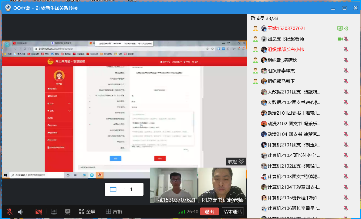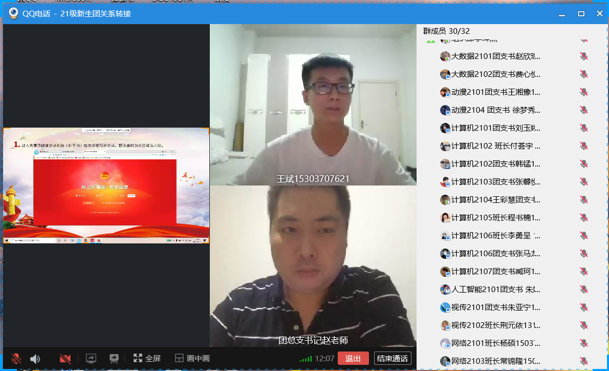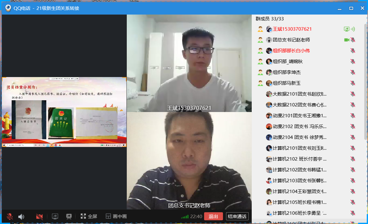 随后,组织部王斌从新生智慧团建登录、新生关系接转入口寻找、新生关系接转信息填写等方面详细地为与会成员讲解了新生团关系转接的操作步骤。主要依托“智慧团建”系统、团员档案相关材料为大家详细说明,并对提出的相关问题进行了细致地线上解答。同学们在线上认真学习、记录,为即将开始的入学后的团组织关系转入工作做好了充足的准备。