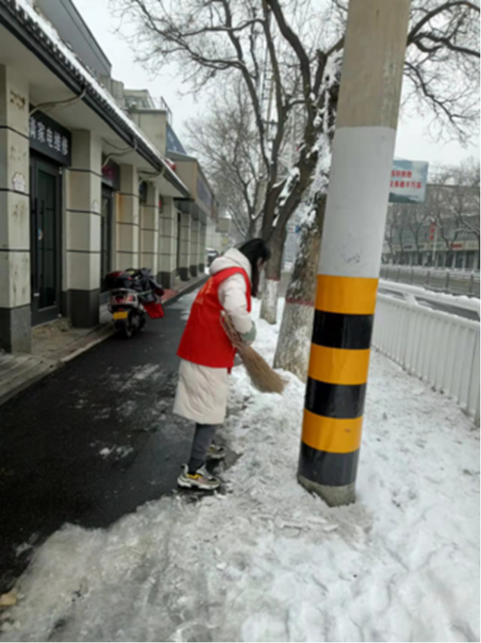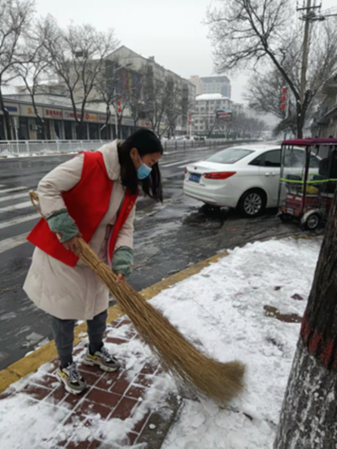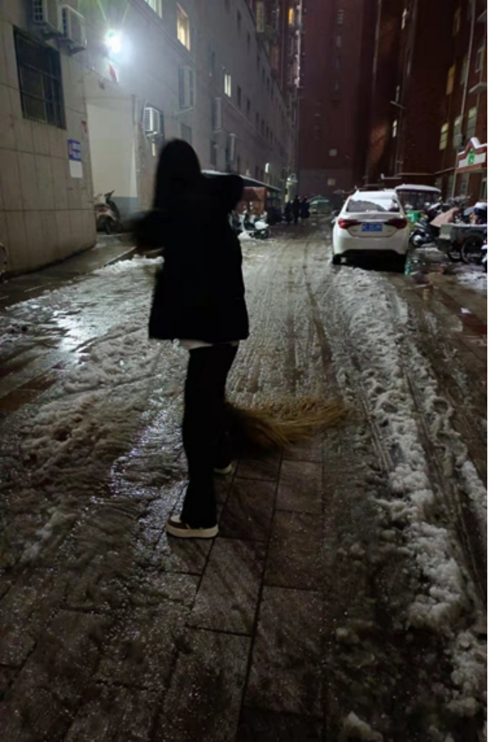 2022年1月22日,太阳成集团tyc33455cc通信2001班的樊晴晴同学,在洛阳迎来了第一场雪,在欣赏雪景的同时,樊晴晴同学也注意到路面上堆积了厚厚的一层雪,已经影响到了道路交通,影响到了社区居民的正常出行,尤其是对老年人造成安全出行的隐患更大。她认为作为老员工的一员,有责任,更有义务为社会做点力所能及的事,于是她主动加入了洛阳市宜阳县白庙居民小区服务队,在1月22日下午5点跟着社区人员前往小区的道路上清扫路面积雪。她说:“虽然付出的不多,也算是为社会贡献了一点点自己的力量。”