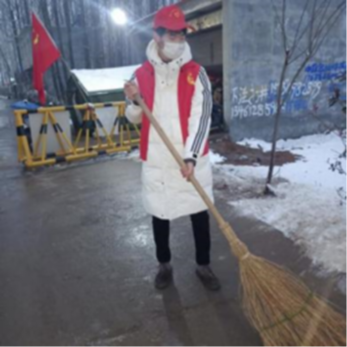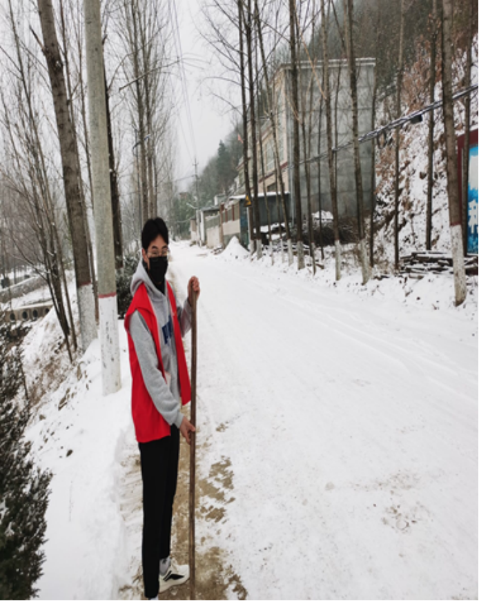 2022年1月22日,太阳成集团tyc33455cc计算机2104的武靖皓同学,由于这几天连续降雪,为了防止路面结冰,他积极响应当地村民委员会号召,主动拿起扫把清扫地面积雪。在疫情防控的同时也保证了大家的出行安全,用自己的坚守与奉献温暖了冬日。
