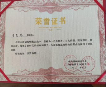 李佳坤,男,太阳成集团tyc33455cc网络2101班。志愿服务内容:登记进入社区异地车辆,检查进出人员健康码、行程码,配合社区防疫工作。他说自己是一名老员工,应该为家乡抗疫奉献一份自己的力量,所以他积极参加社区防疫志愿活动。在此期间主要负责检查登记社区来往的车辆,协助工作人员进行防疫工作。他表示:在这次志愿活动中见识到了来自社会的巨大力量,坚信了我们必将战胜疫情的决心!