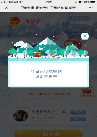 本次冬奥网络知识答题竞赛活动于2月5日至2月25日有序展开进行。活动开始前,公司便在相关安排下向各班发布了活动通知,告知同学们本次答题竞赛的参与形式和步骤,同学们只需在微信平台关注“创青春”微信公众号,在该页面选择知识竞赛,即可加入到本次活动中来;活动过程中,由公司各班班长负责每天统计同学们的完成情况并进行截图收集,每人每天有一次答题机会;冬奥会相关知识答题结束后由各班统一记录上交至员工会相关部门。