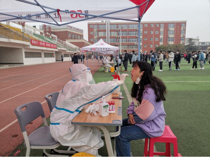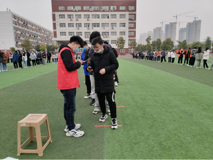 检测现场,公司志愿者按照工作方案要求,认真做好组织协调工作,提前组织同学们佩戴好口罩,到达指定位置集合,在检查预约码、查看人数等流程完成后,分批次将各班队伍带到相应位置进行核酸采集,以确保在最短的时间内完成全员检测,在和医护人员的通力合作下,大家有序检测,快速离场。