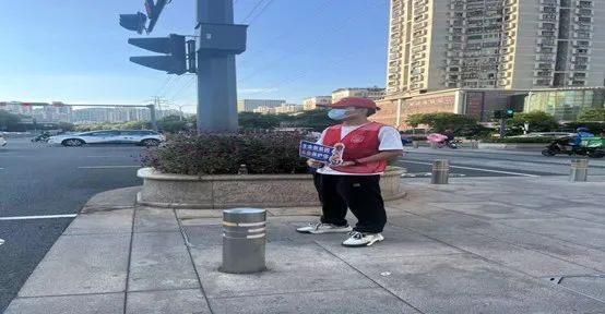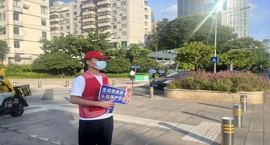 身着鲜艳的服装,在深圳市福田区红荔西路与农林路交通路口,举着一块标语"生命很美丽,头盔保护您"。周鑫同学以手势、语言等多种方式,对骑电动车不戴头盔、违规载人等不文明行为进行了耐心的劝导和教育,引导辖区居民树立起正确的交通安全意识。为整个社会营造了一个更加安全、文明的交通环境。